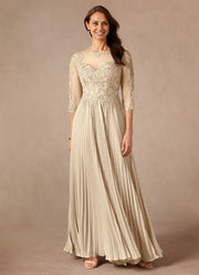 Vestido de gasa con apliques en forma de A color champán, largo hasta el suelo, manga tres cuartos, color liso, moderno, espalda en V, escote redondo, para madre de la novia - EE. UU. 2 / Reino Unido 6 / UE 32