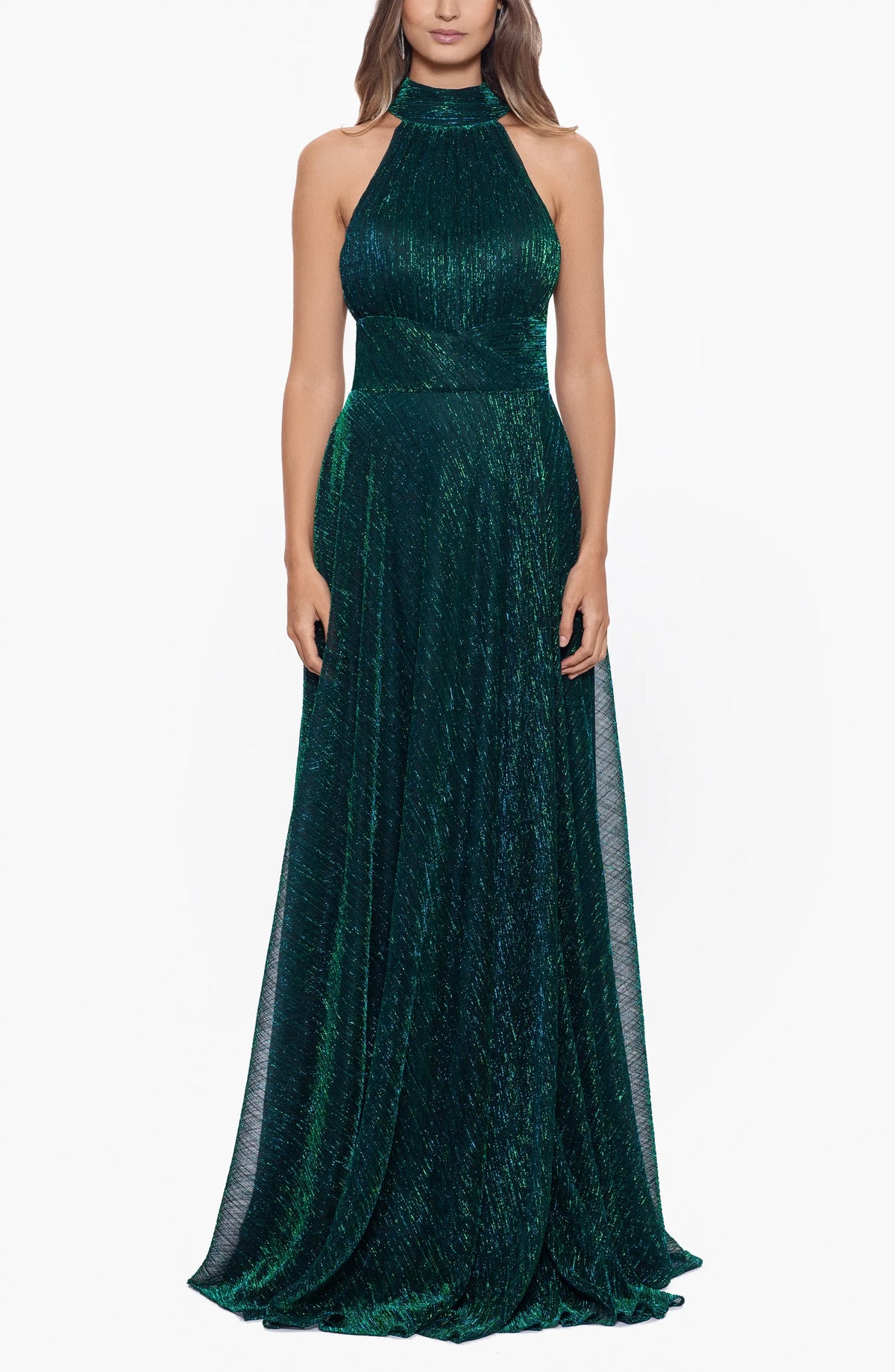 weitese's Elevate your sophisticated allure with this emerald green metallic halter gown. It features shimmering metallic fabric with a halter neckline for opulent charm, a ruched waist and flowing skirt for refined elegance, and a backless design that adds a touch of glamorous flair. The rich emerald green hue ensures a captivating finish, making it perfect for formal events, red carpet appearances, or any occasion where you want to embrace bold luxury with polished, show-stopping style.