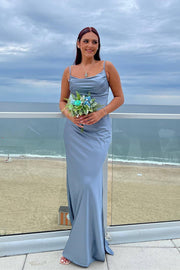 Vestido largo de dama de honor azul polvoriento con cuello vuelto/Vestidos formales para mujer