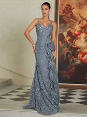 weitese's Elevate your glamorous look with this silver sequin mermaid maxi dress. It features all-over sequin detailing for opulent allure, a sweetheart neckline with spaghetti straps for refined charm, and a ruffled side detail with mermaid silhouette for sophisticated flair. The high-shine sequin fabric ensures a showstopping finish, making it perfect for formal events, red carpet outings, or any occasion where you want to make a bold, sparkling statement.
