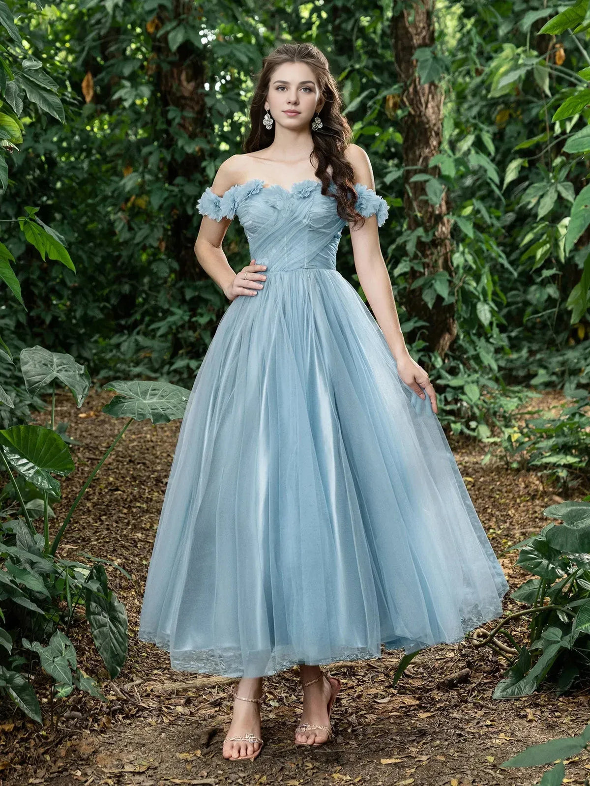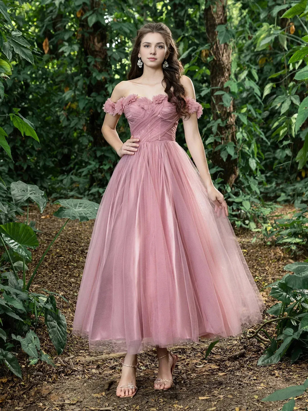 weitese's Elevate your romantic elegance with this blush pink tulle off-shoulder tea-length ball gown. It features soft tulle fabric with an off-shoulder neckline and floral appliqués for opulent allure, a voluminous tea-length skirt for refined charm, and a lace-up back detail for sophisticated flair. The delicate blush pink hue ensures a timeless finish, making it perfect for formal events, weddings, or any occasion where you want to blend vintage romance with modern grace.