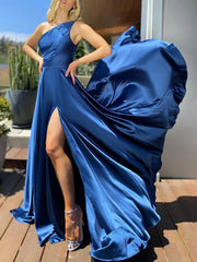Vestidos de corte A/princesa de satén con efecto seda, volantes, un hombro, sin mangas, con cola larga