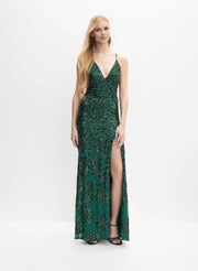 weitese's Elevate your glamorous allure with this emerald green sequin spaghetti strap gown. It features intricate sequin floral detailing for opulent charm, a plunging V-neckline and high slit for refined elegance, and a lace-up back detail that adds a touch of polished flair. The vibrant emerald green hue ensures a captivating finish, making it perfect for formal events, galas, or any occasion where you want to embrace bold luxury with show-stopping style.