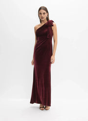 weitese's Elevate your sophisticated allure with this burgundy velvet one-shoulder gown. It features luxurious velvet fabric with a one-shoulder neckline and statement bow detail for opulent charm, a fitted silhouette and floor-length cut for refined elegance, and a sleek design that adds a touch of polished flair. The rich burgundy hue ensures a captivating finish, making it perfect for formal events, galas, or any occasion where you want to embrace timeless luxury with show-stopping style.