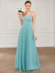 Vestido de dama de honor Weitese con escote en V brillante, corte A y paneles de ilusión - EE. UU. 2 / Reino Unido 6 / UE 32