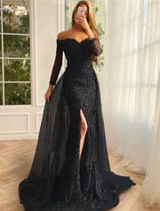 Vestido de noche Weitese de sirena/trompeta, floral, formal, para boda, con cola larga, hombros descubiertos, para recepción de boda de otoño, de gasa con apliques de abertura. - Negro / EE. UU. 2 / Reino Unido 6 / UE 32