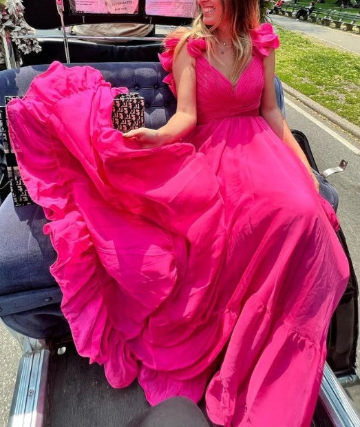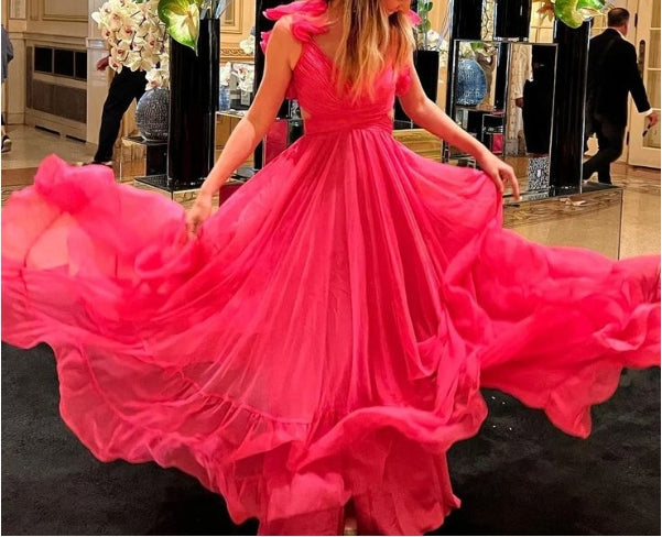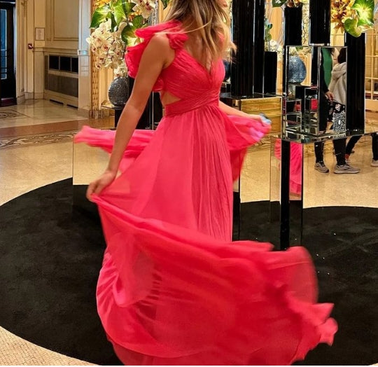 Robe de bal longue trapèze à lacets et volants, décolleté en V plongeant
