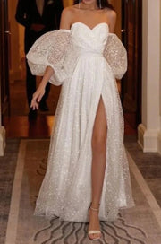 Robe de bal longue trapèze/princesse à manches courtes et décolleté en cœur, longueur au sol, avec fente sur le côté