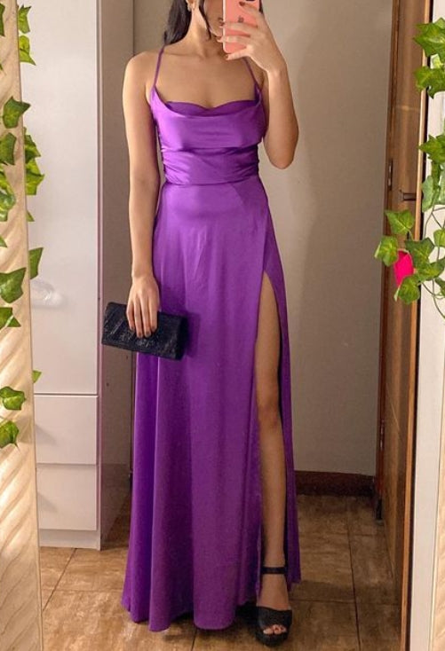 Robe de bal longue fendue à bretelles spaghetti et coupe trapèze