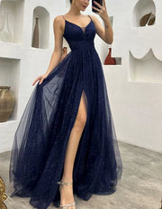 Robe de bal longue trapèze à bretelles spaghetti et col en V