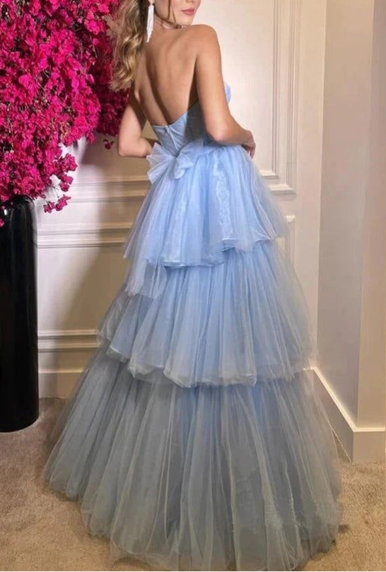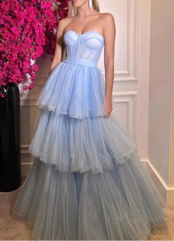 Robe de bal trapèze en tulle à volants et décolleté en cœur, longueur au sol