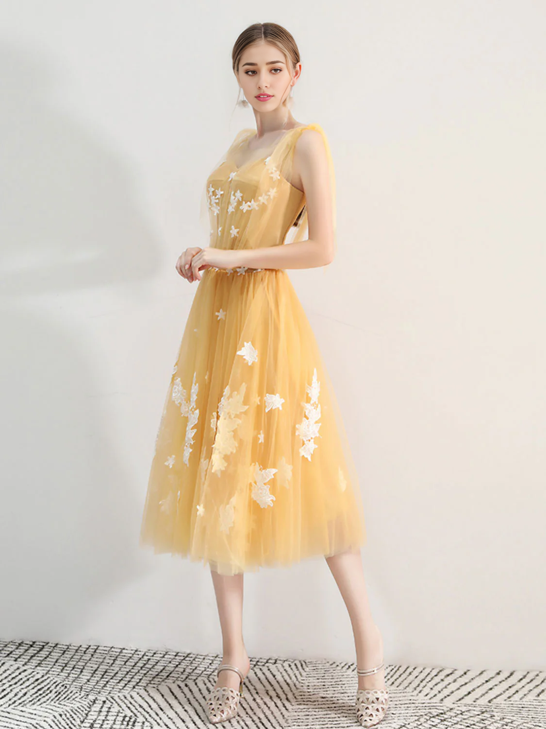 Robe de bal trapèze en tulle et dentelle, dos nu, avec appliques