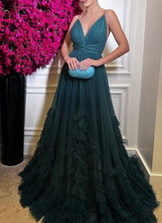 Robe de soirée trapèze en tulle à bretelles spaghetti et dos nu