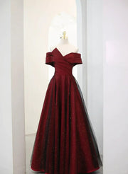 Robe de soirée longue en tulle rouge vin à épaules dénudées et coupe trapèze