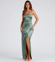 weitese's Elevate your formal look with this sage green satin maxi dress. It features a satin fabric for luxurious shine, a cowl neck design for elegant charm, and a high side slit for dynamic movement. The ruched detailing offers a flattering silhouette, making it perfect for evening galas, weddings, or any occasion where you want to showcase timeless sophistication with a touch of glamorous satin and refined tailoring.