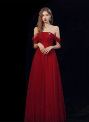 Robe de soirée trapèze en tulle rouge vin à épaules dénudées