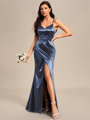 Robe de demoiselle d'honneur moulante en satin extensible à bretelles spaghetti et à plis sur le devant de Weitese - US 2 / UK 6 / UE 32