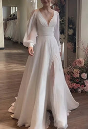 Robe de bal de mariage en mousseline de soie, col en V, manches longues, avec fente