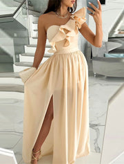 Robe de soirée pour femme, robe d'invitée de mariage, robe trapèze, robe longue, robe longue, vert, noir, vin, sans manches, couleur unie, volants, printemps, été, asymétrique, soirée, slim
