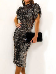 Robe à paillettes pour femme, robe de soirée scintillante, robe de soirée moulante, robe mi-longue noire à manches courtes, automne, printemps, été, col montant, robe de cocktail noire