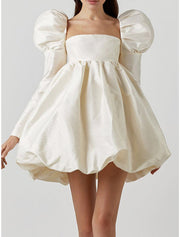 Robe de soirée pour femme, robe de bal, robe de cocktail, mini robe, fuchsia, beige, manches longues, unie, froncée, été, printemps, automne, col carré, élégante, invitée de mariage, anniversaire, vacances