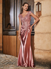 Robe de soirée sirène en satin rose poudré avec corset à col en V et perles - US 2 / UK 6 / UE 32