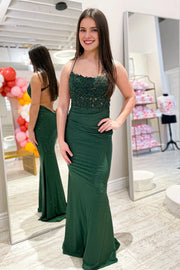 Robe de soirée sirène à bretelles spaghetti et longueur au sol, ornée de perles, vert chasseur
