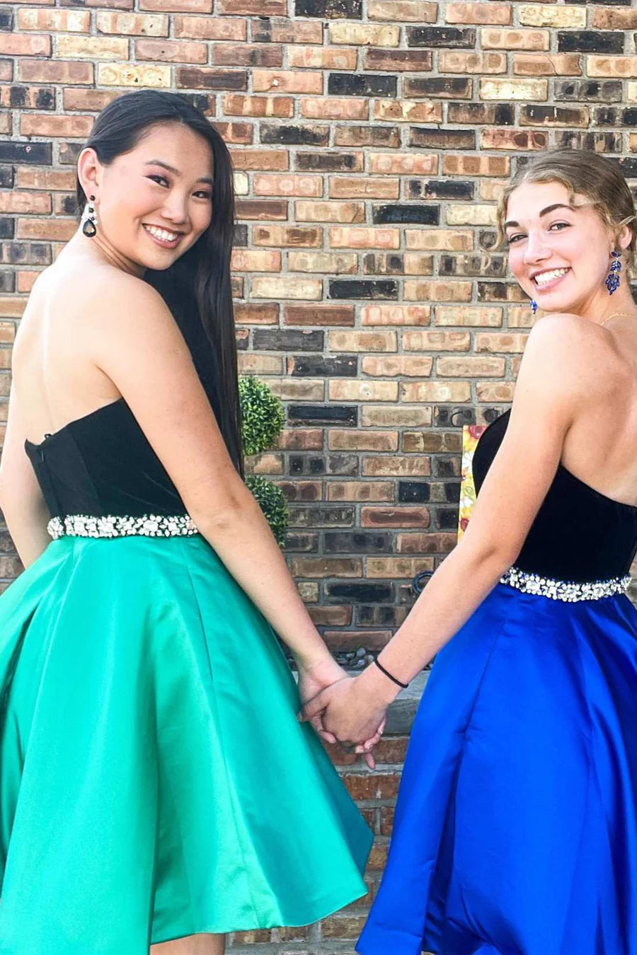 Robe de soirée courte trapèze sans bretelles avec ceinture et poches