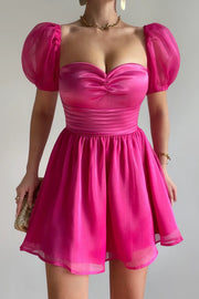 Robe de soirée rose vif à manches courtes bouffantes et dos nu, coupe trapèze