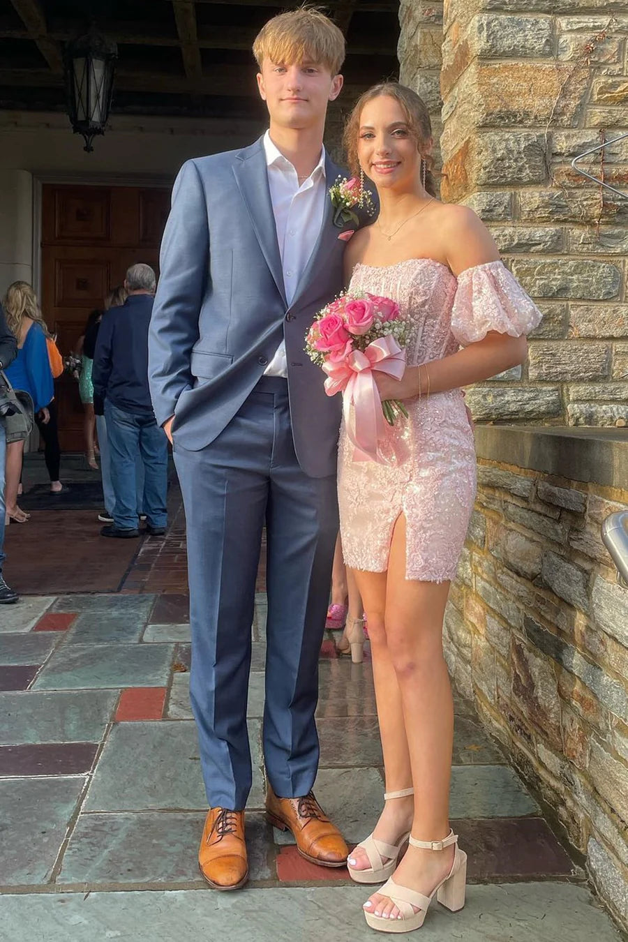 Robe de soirée courte bustier en dentelle à paillettes et manches bouffantes