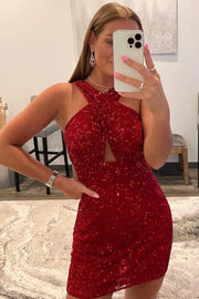 Robe de soirée courte bordeaux sans manches, dos nu, paillettes