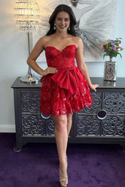 Robe de soirée scintillante à épaules dénudées, coupe trapèze, décolleté en cœur et volants, avec nœud papillon - Rouge / US 2 / UK 6 / UE 32