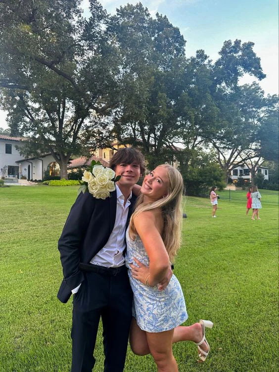 Robes de bal Weitese, jolies robes de soirée courtes sans bretelles bleues et blanches
