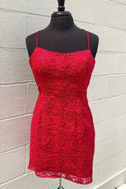 Robe de soirée moulante en dentelle rouge Weitese avec bretelles spaghetti