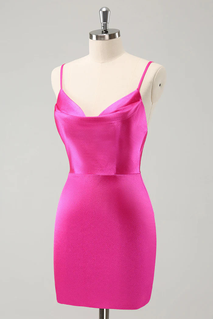 Robe Weitese simple rose vif col bénitier dos nu moulante courte robe de soirée sans manches
