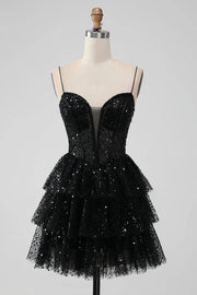 Robe Weitese noire scintillante à bretelles spaghetti, robe de soirée courte à plusieurs niveaux, paillettes, sans manches