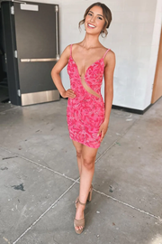 Robe de bal courte rose à bretelles spaghetti et broderies pour femme