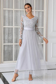 weitese's Elevate your formal look with this silver grey maxi dress. It features intricate floral lace appliqués on the long sleeves and bodice for elegant charm, a flowing polka dot tulle skirt for graceful movement, and a satin waistband for refined style. The V-neckline adds a touch of allure, making it perfect for weddings, evening galas, or any occasion where you want to showcase timeless sophistication.