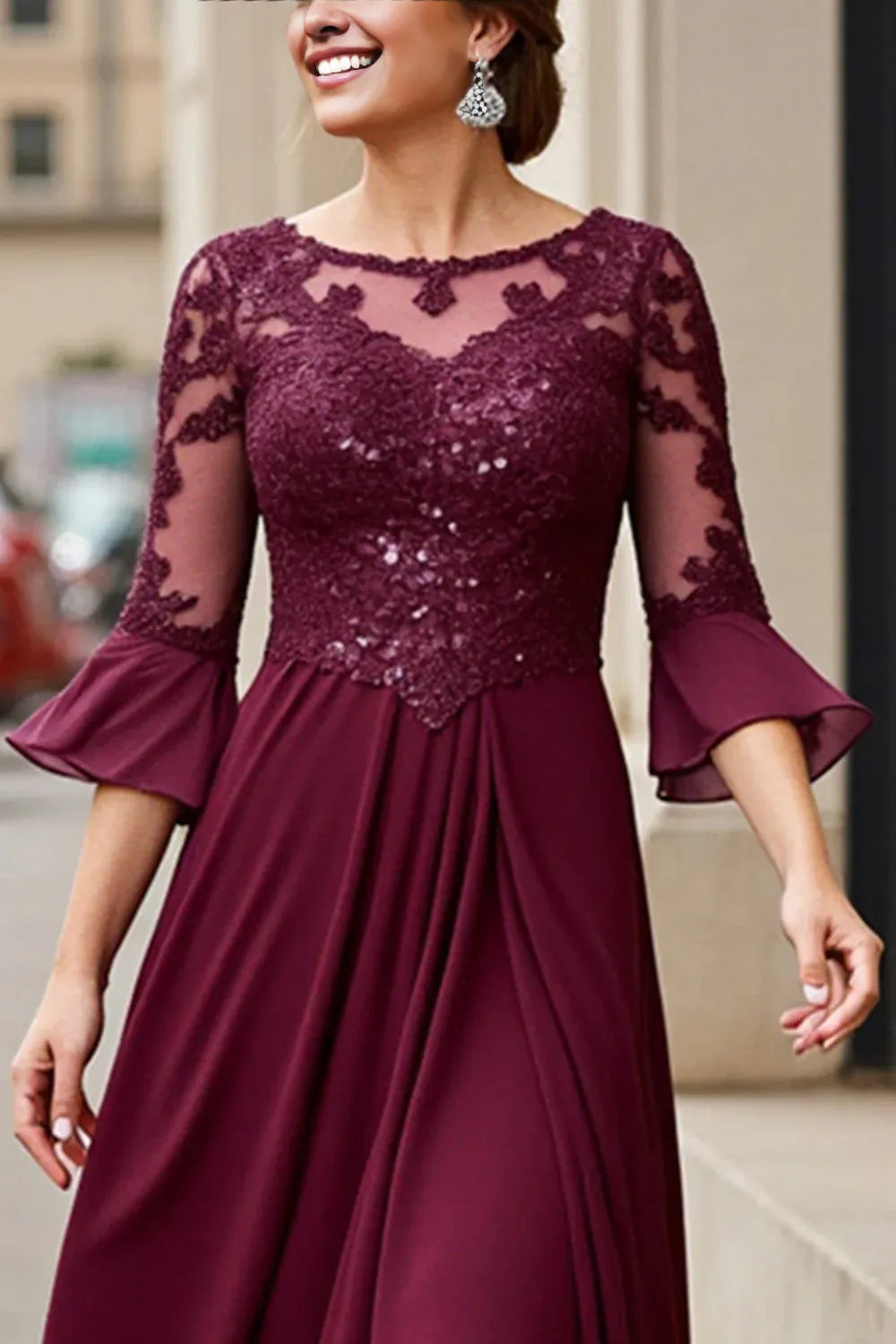 weitese's Elevate your formal look with this burgundy midi dress. It features intricate lace detailing with bell sleeves for elegant charm, a sheer lace back for alluring style, and sequin accents for subtle sparkle. The flowing chiffon skirt ensures graceful movement, making it perfect for weddings, evening events, or any occasion where you want to showcase timeless sophistication.