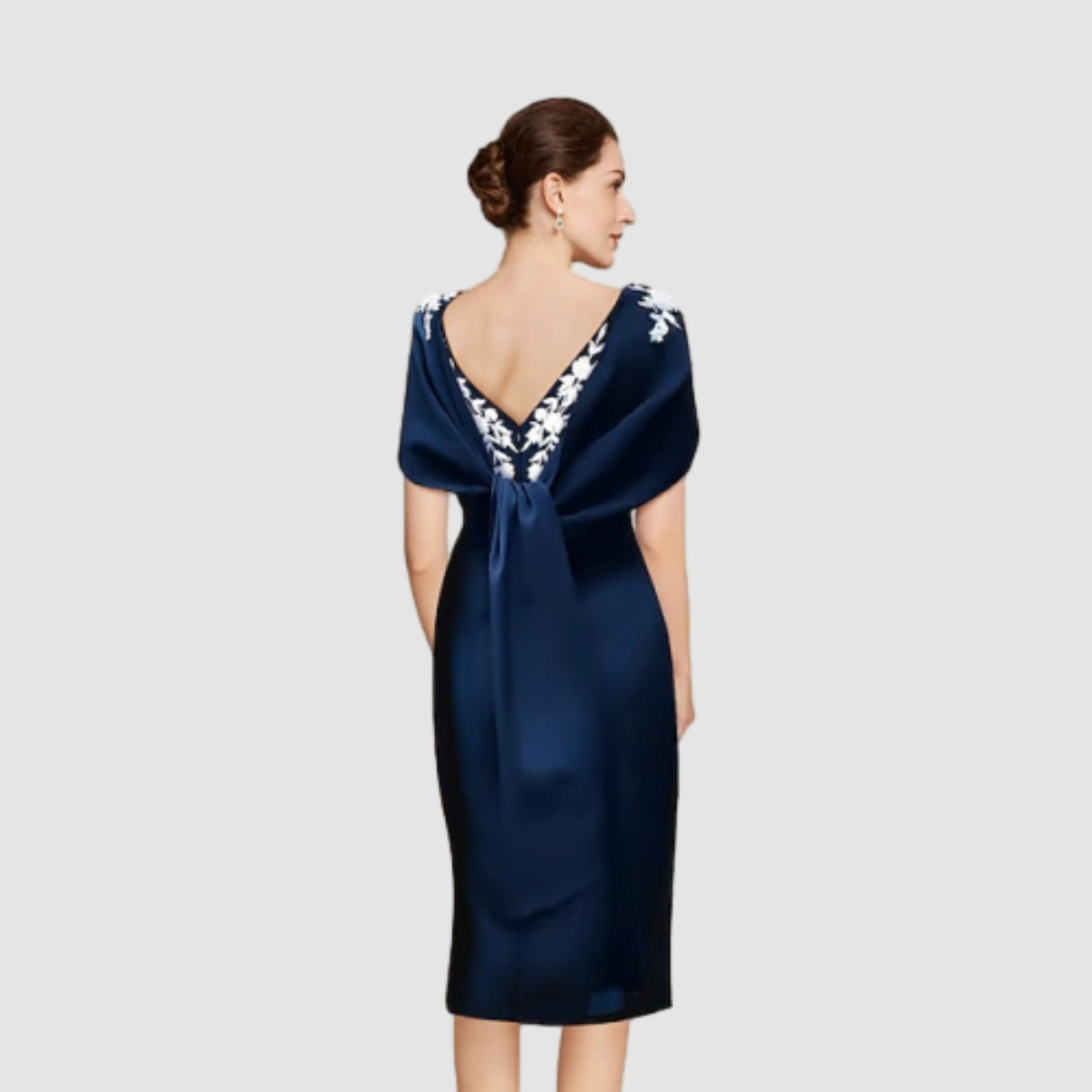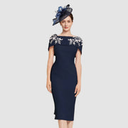 Sublimez votre tenue de mère de la mariée avec cette robe fourreau sophistiquée. Dotée d'un élégant décolleté épaules dénudées et d'une coupe mi-longue, cette robe allie simplicité intemporelle et détails raffinés. Ses manches courtes offrent une couverture confortable, tandis que ses nœuds délicats, ses perles et ses broderies raffinées créent une finition luxueuse qui sera magnifiquement photographiée pour le grand jour de votre fille.