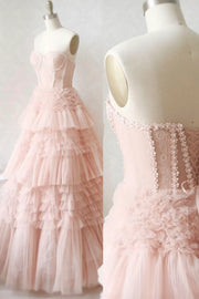 Robe de bal longue en tulle rose sans bretelles et dentelle