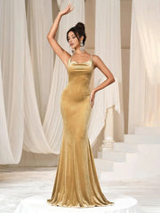 weitese's Elevate your luxurious allure with this gold velvet mermaid maxi dress. It features plush velvet fabric with a cowl neckline for opulent allure, a figure-hugging mermaid silhouette for refined charm, and a crisscross back design with delicate straps for sophisticated flair. The rich gold hue ensures a standout finish, making it perfect for formal events, evening galas, or any occasion where you want to blend classic luxury with textural, eye-catching design.