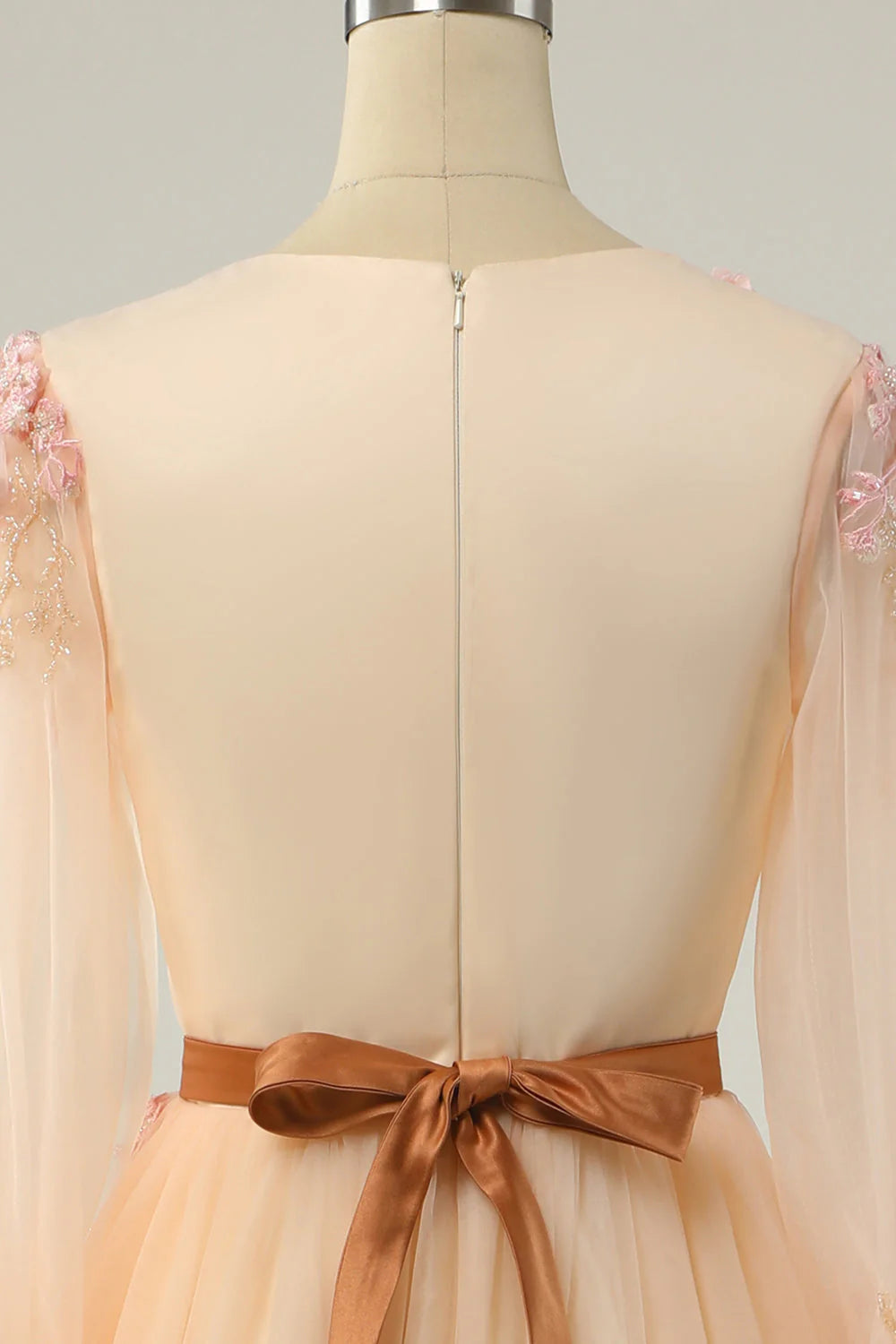 Robe de bal longue élégante à col en V et coupe trapèze, couleur abricot, avec applications
