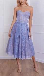 Robe de bal trapèze à épaules dénudées, sans bretelles, avec ceinture et fermeture éclair dans le dos en dentelle - Bleu / US 2 / UK 6 / UE 32