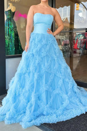Robe de bal longue bleue élégante, décolletée en V, sans bretelles, avec volants
