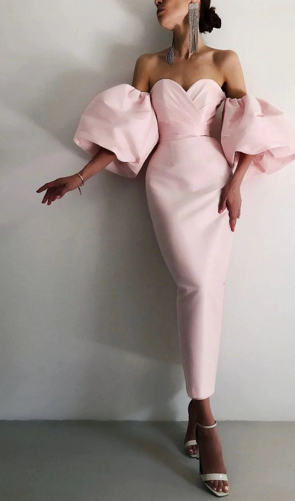 Robe de bal rose bustier en satin à manches bouffantes