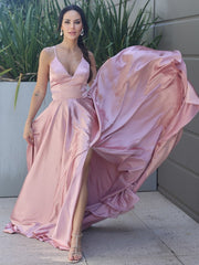 Robe en satin soyeux à volants, col en V, sans manches, traîne courte