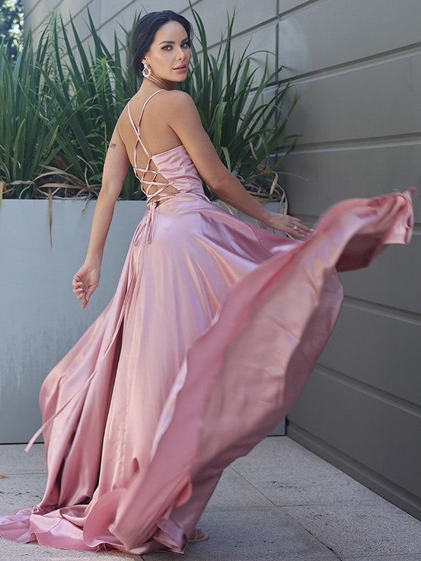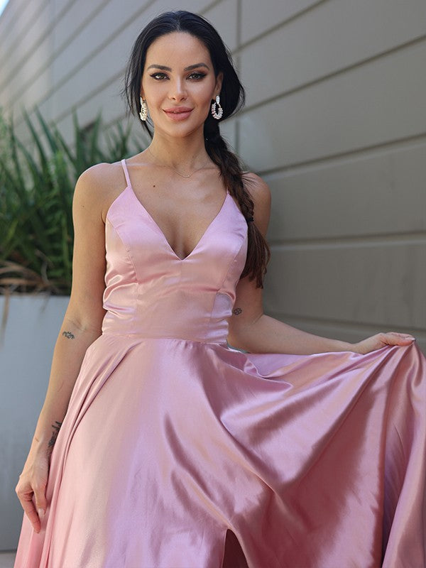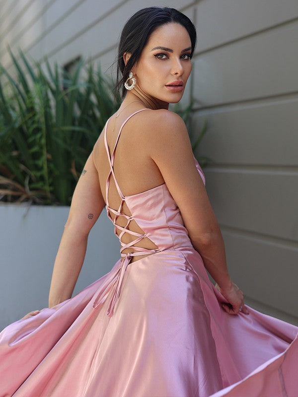Robe trapèze/princesse en satin soyeux à volants, col en V, sans manches, traîne courte