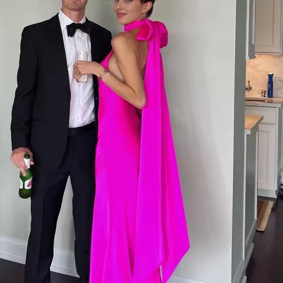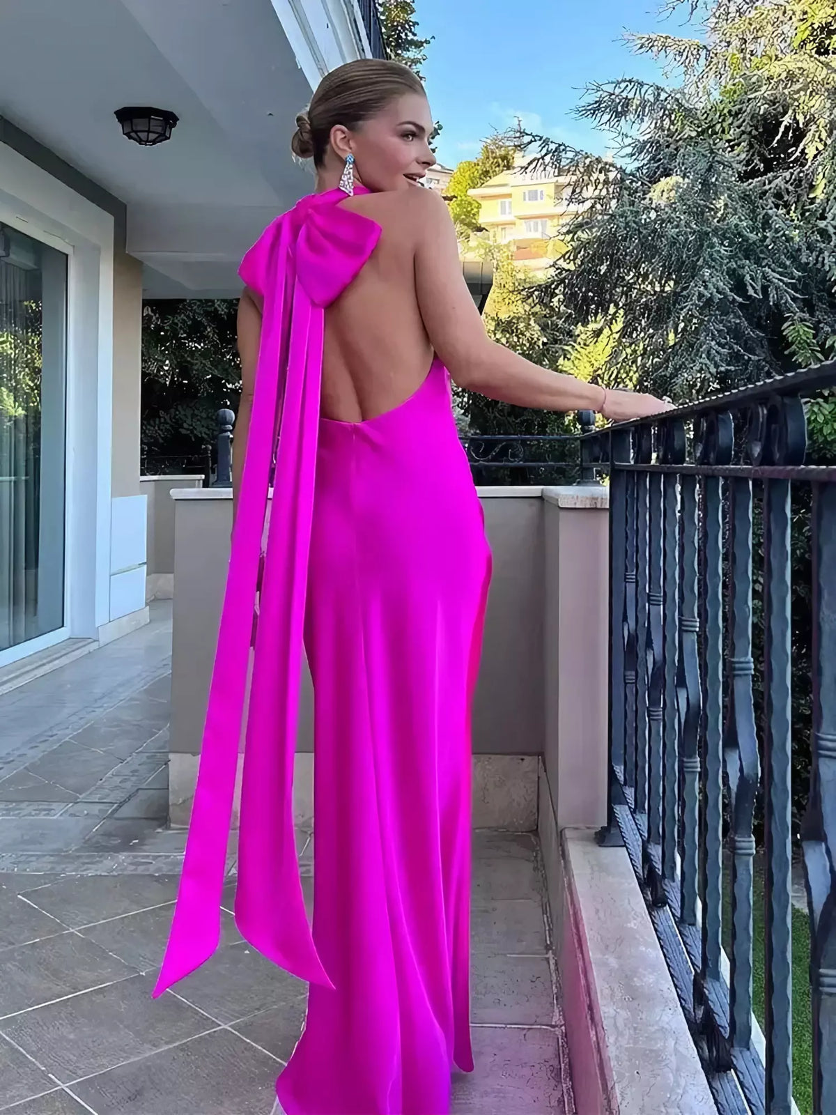 Robe longue rose vif pour femme, tenue de bal sexy, dos nu, épaules dénudées