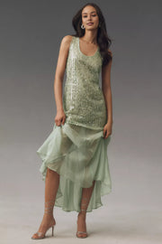 Robe Weitese à sequins, col en U, en mousseline de soie, robe longue, couleur sauge, sans manches, tube droit, robe de bal